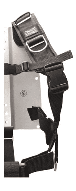 It may be adapted to grow with you including consideration for torso length and shoulder width. This harness is fully adjustable and fits all Custom Divers wing systems and all makes of backplates. The shoulder clip configuration is designed to allow full adjustability for both shoulders, also featuring two break points. The Mini harness is equipped with four D-rings and a crotch strap made from two inch wide webbing preventing the rig slipping down towards the divers head if inverted and includes a accessories attachment d-ring.